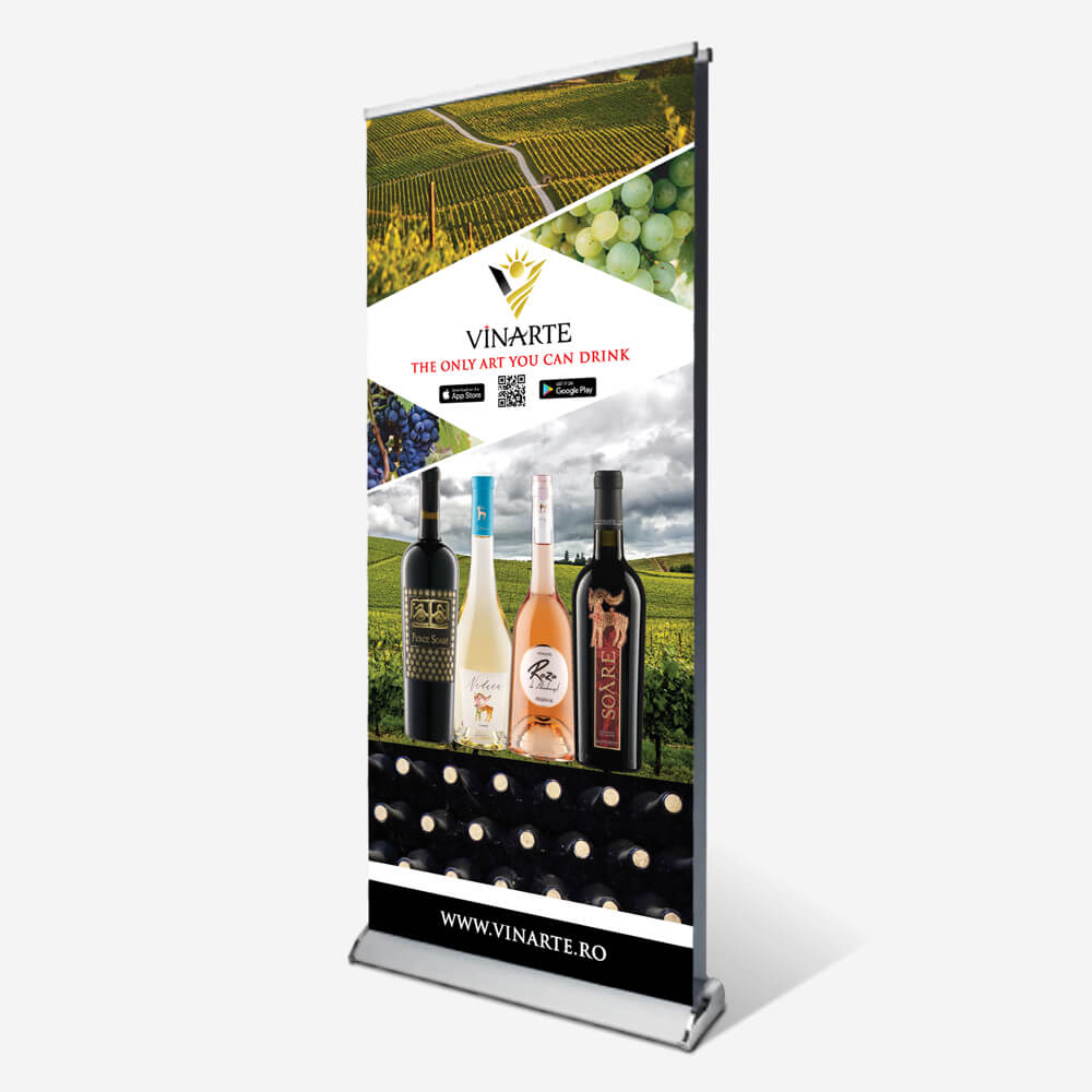 Pretul de 145 lei (+TVA) include printul full-color pe polipropilena cu spate gri rezistenta de 250 microni, sistemul din aluminiu gri metalizat + geanta de protectie si transport. Suprafata vizibila si printabila a roll-up-ului este de 85 x 200 cm (l x h).